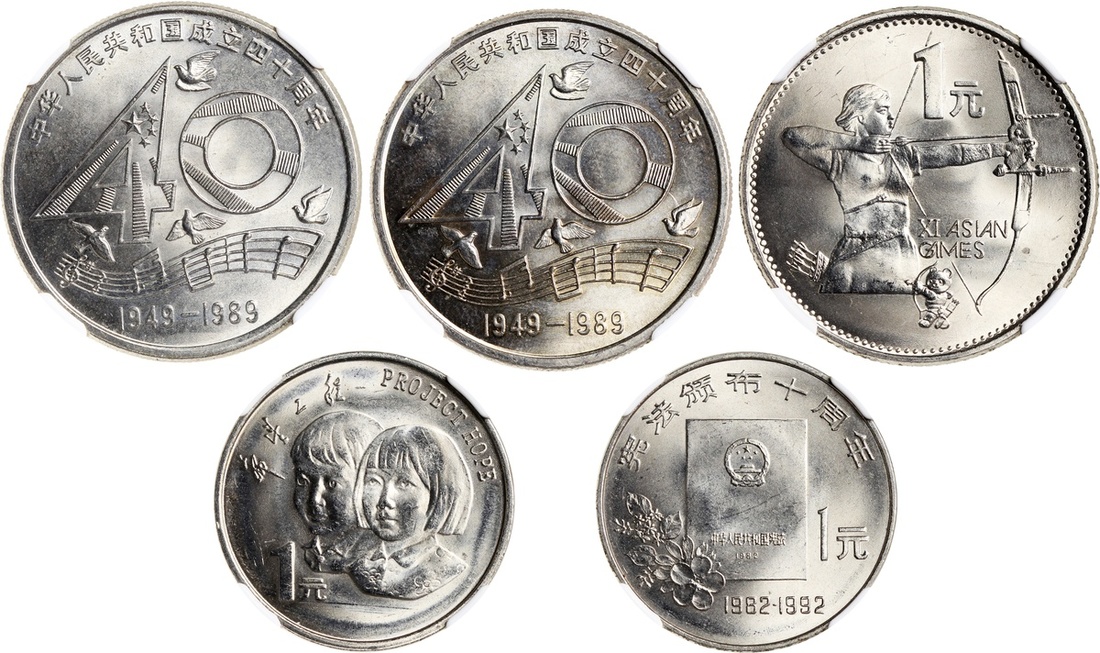 China, a lot of 5x nickel 1 yuan, including 2x 1989 40th Republic Anniversary, 1990 Asian Games- Archery, Constitution 10th Anniversary and 1994 Project Hope, all graded by NGC, the Project Hope MS64, others MS66.(5)