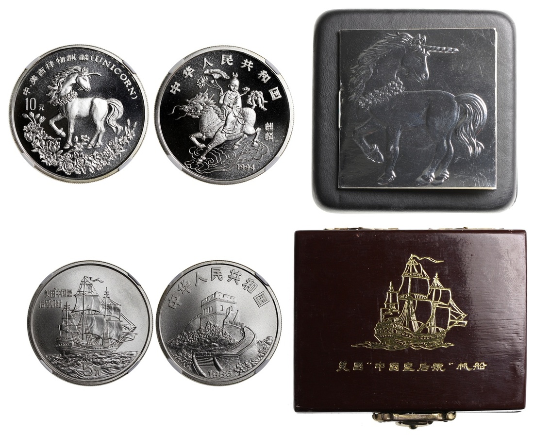 People's Rebublic of China, silver 10 Yuan, 'Unicorn', 1994, weighs 1oz and of .999 silver, also 5 yuan, 1986, 'Empress of China',