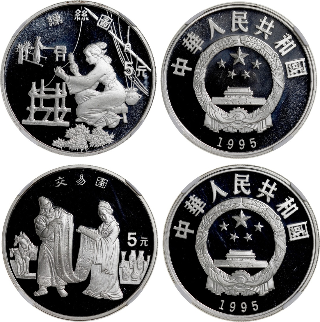 People's Republic of China, Silk Road Series I, 5 Yuan silver proof coins, 1995, 'Silk Merchant' and 'Silk Spinner', graded NGC PF69 and PF68 Ultra Cameo (2)