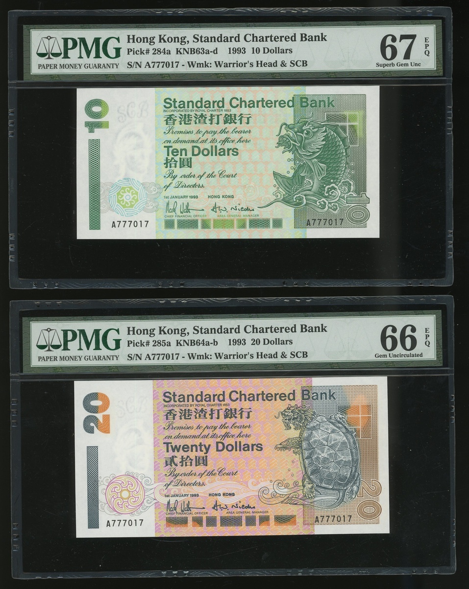 Standard Chartered Bank, pair of $10 and $20, 1.1.1993, same serial A777017 for both, (Pick 284a, 285a), graded PMG 67EPQ and 66EPQ respectively (2)