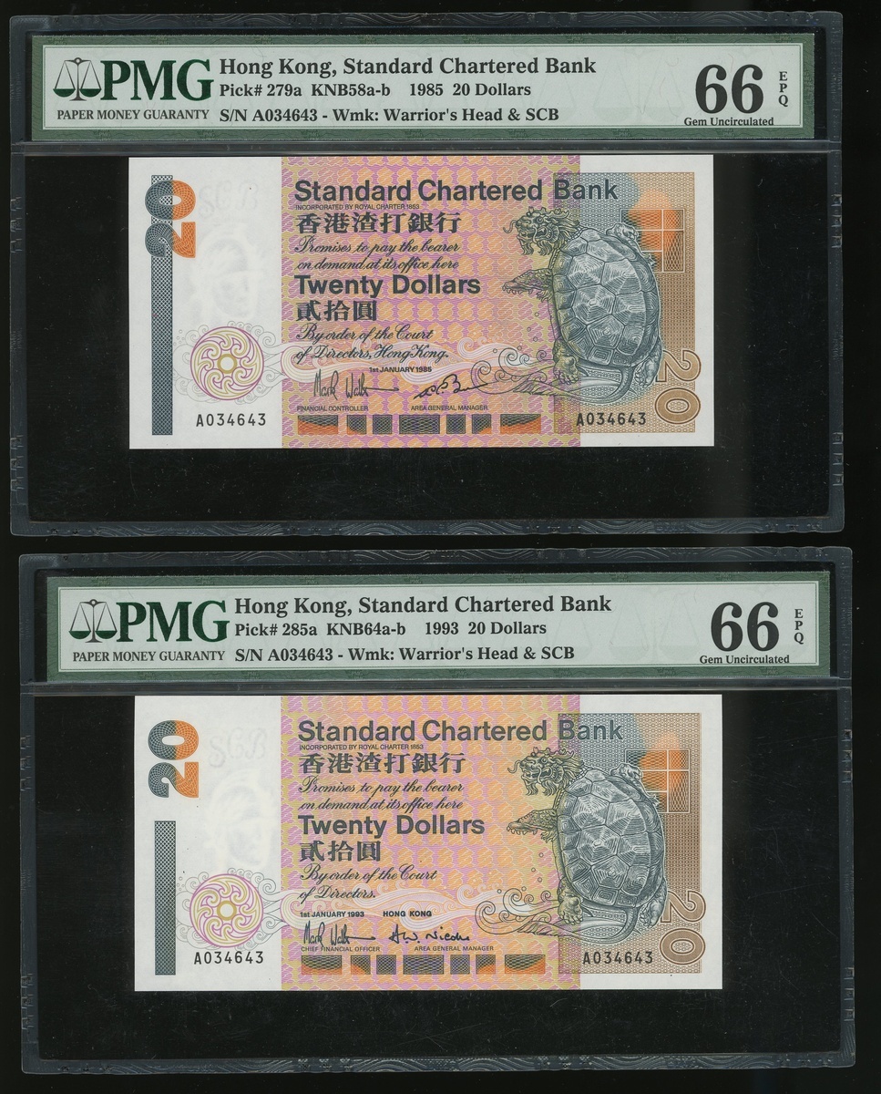 Standard Chartered Bank, a pair of $20, 1985 and 1993, with identical serial number A034643, (Pick 279a, 285a), both PMG66EPQ, gem uncirculated.(2)