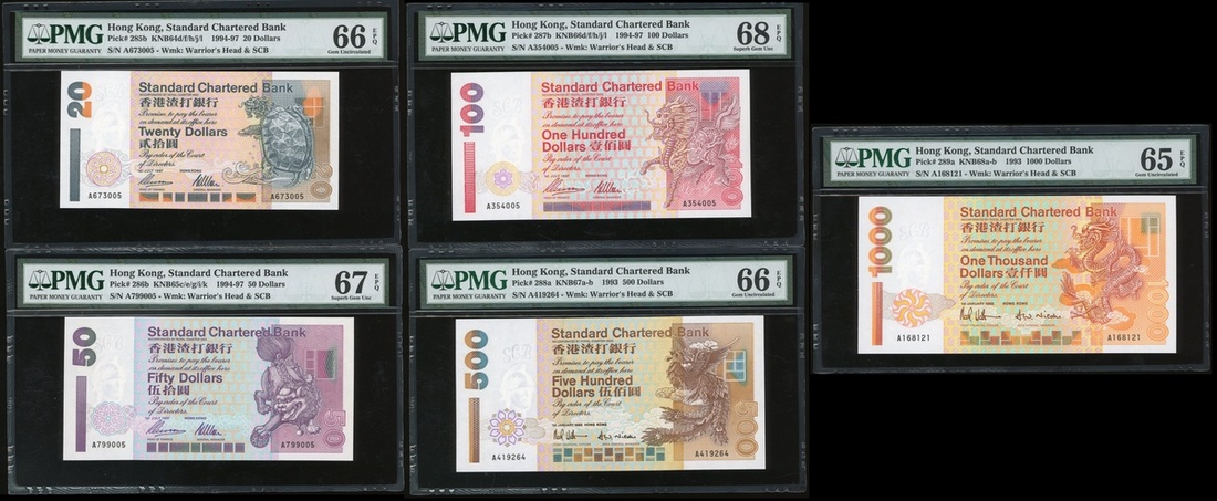 Standard Chartered Bank, a near complete set of 5 of the 1993-2002 series, containing $20, $50 and $100, dated 1.7.1997, and $500 and $1000, dated 1.1.1993, (Pick 285b, 286b, 287b, 288a, 289a), graded PMG 66EPQ, 67EPQ, 68EPQ, 66EPQ and 65EPQ respectively (5)