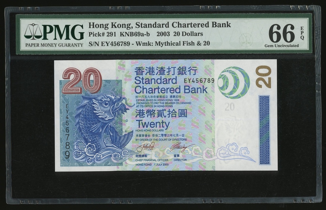 Standard Chartered Bank, $20, 1.7.2003, ascending serial number EY456789, (Pick 291), PMG 66EPQ Gem Uncirculated