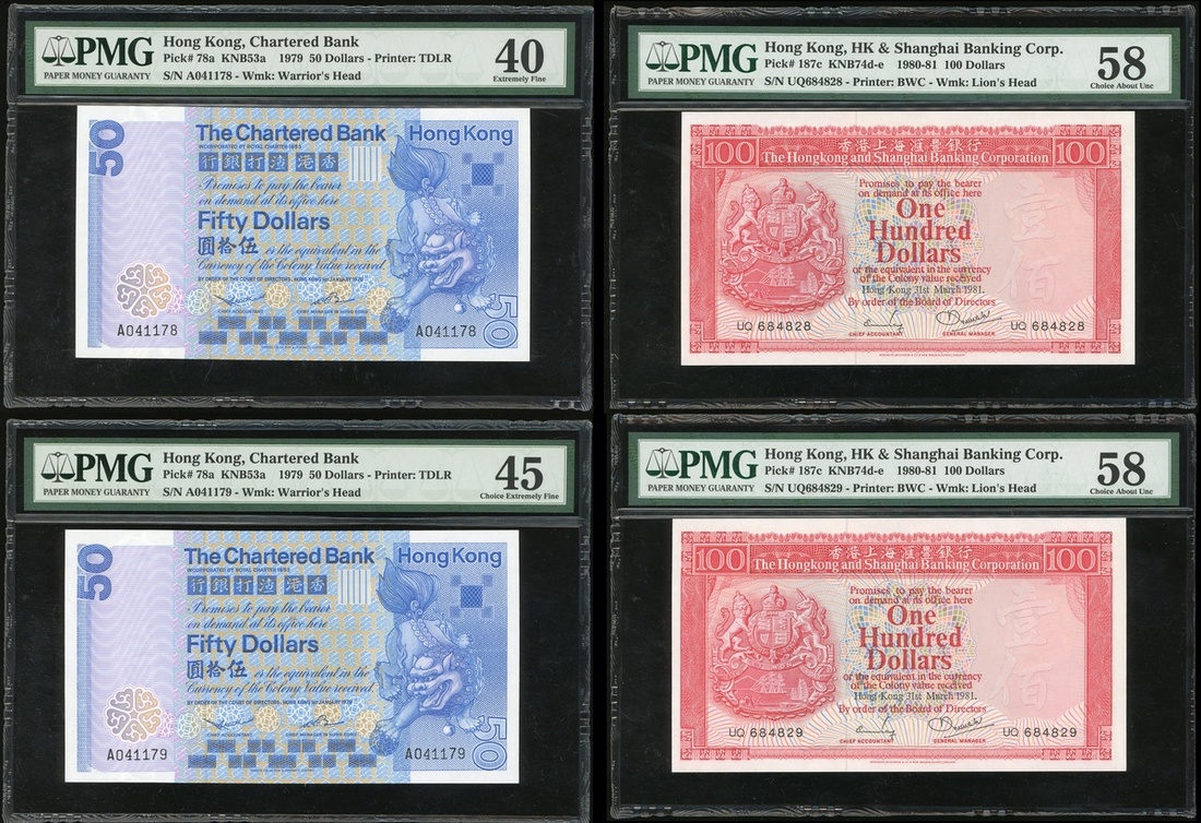 The Chartered Bank, a pair of $50, 1.1.1979, serial numbers A041178-79, and also HSBC, $100, 31.3.1982, serial numbers UQ 684828 and 829,