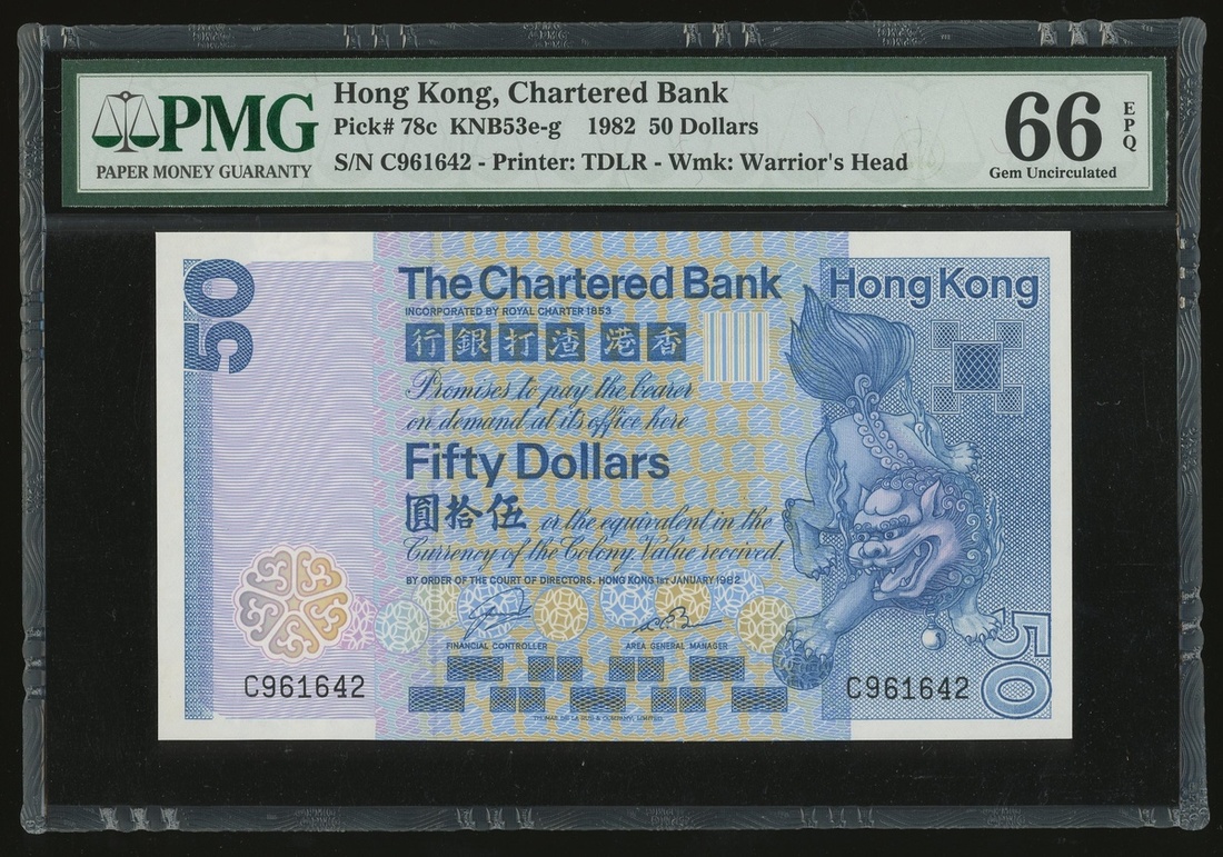 The Chartered Bank, $50, 1.1.1982, serial number C961642, (Pick 78c), PMG 66EPQ Gem Uncirculated