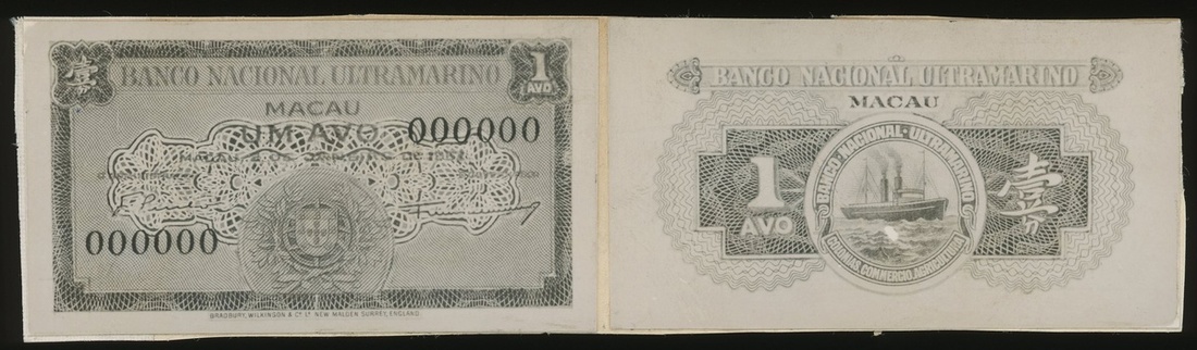 Macau: Banco Nacional Ultramarino, an obverse and reverse photographic proof for an unissued design of a 1 Avo, no dated, obverse bank arms at lower centre, reverse steam ship at centre, guilloche patterns,