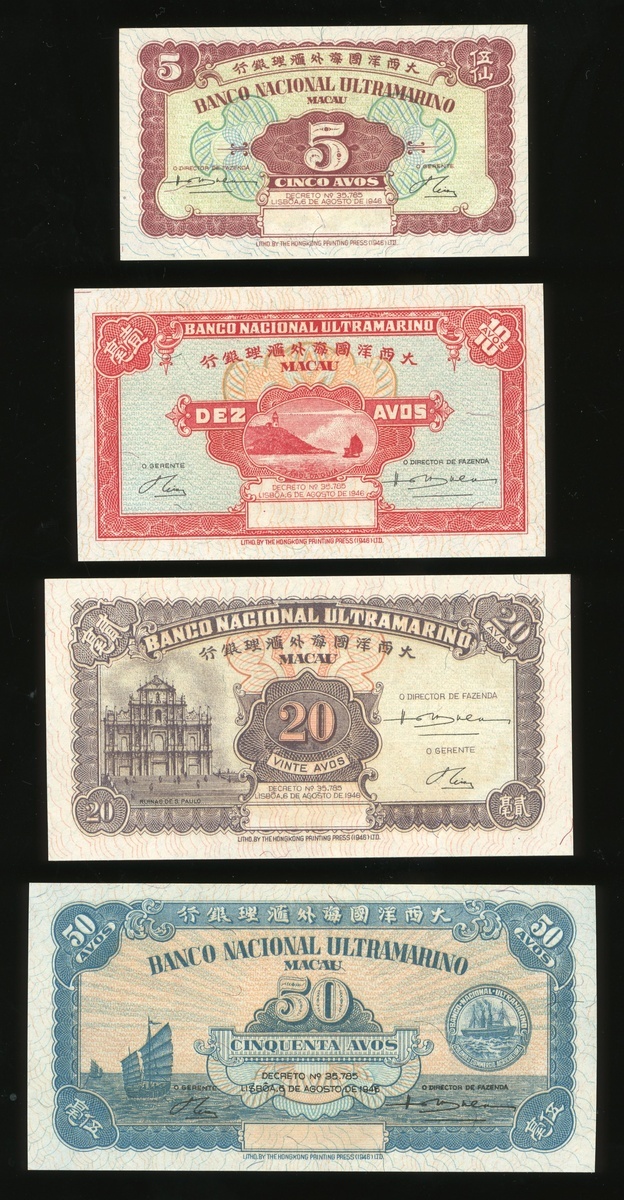 Macau: Banco Nacional Ultramarino, set of 4 fractional notes, 5, 10, 20 and 50 avos, 1946, remainders without serials,