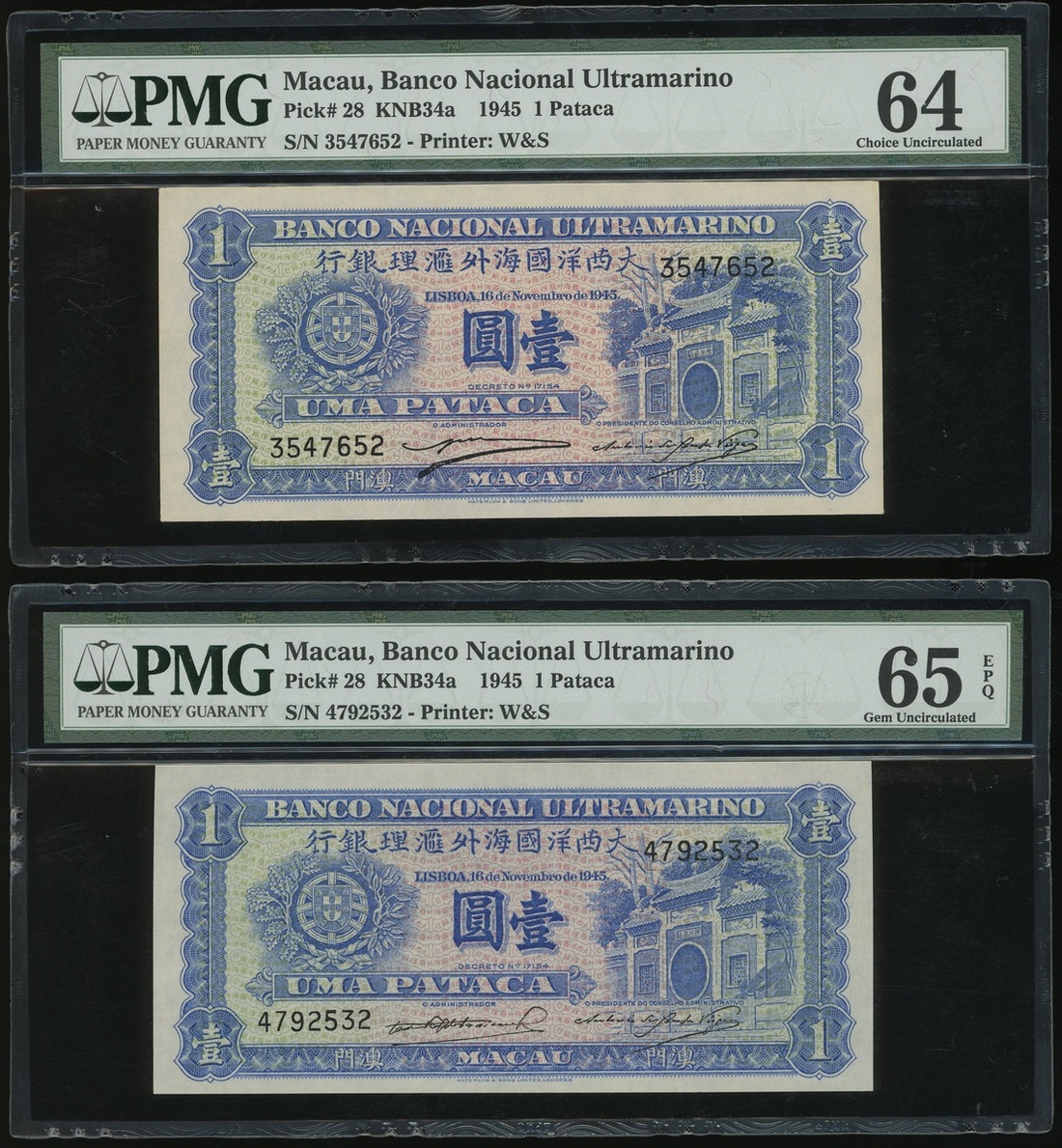Macau: Banco Nacional Ultramarino, a pair of 1 Pataca, 16.11.1945, serial numbers 3547652 and 4792532, (Pick 28), graded PMG 64 and 65EPQ respectively (2)