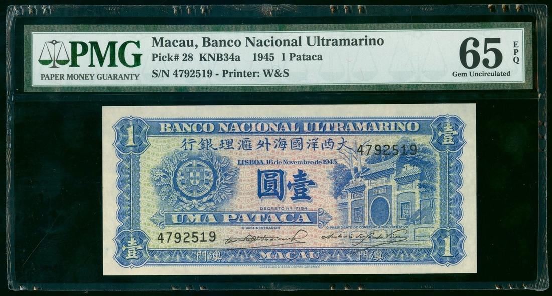 Macau: Banco Nacional Ultramarino, 1 patacas, 1945, serial number 479519, (Pick 28), PMG 65EPQ Gem Uncirculated