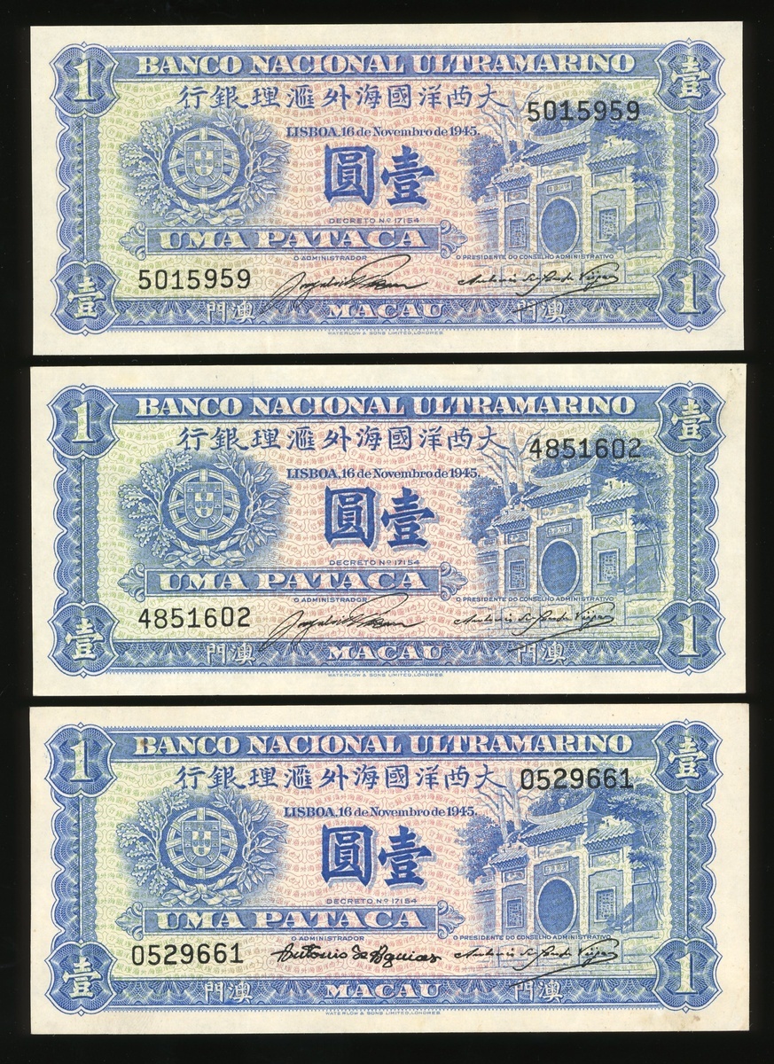 Macau: Banco Nacional Ultramarino, lot of 3x 1 patacas, 1945, serial numbers 0529661, 4851602 and 5015959,