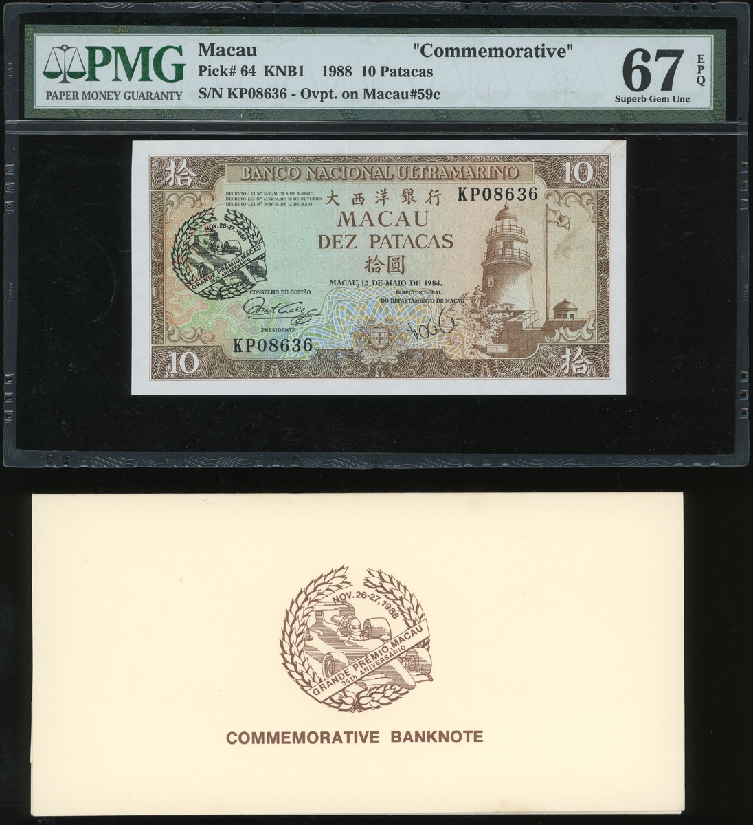 Macau: Banco Nacional Ultramarino, Grand Prix commemorative 10 Patacas, 1984 with 1988 overprint, serial number KP08636, (Pick 64), PMG 67EPQ Superb Gem Uncirculated, with original envelope of issue