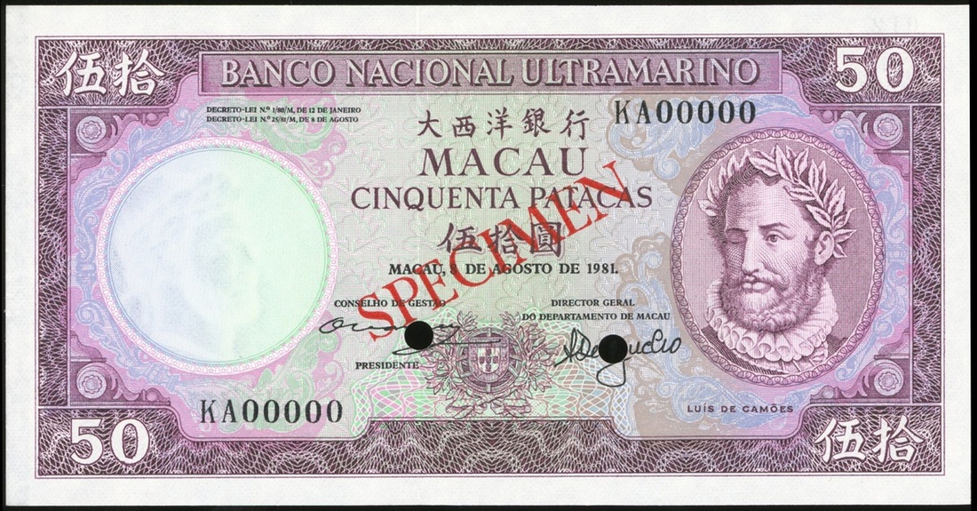 Macau: Banco Nacional Ultramarino, 50 patacas, 1981, specimen, black serial number KA00000, control number 012, (Pick 60s1), uncirculated.