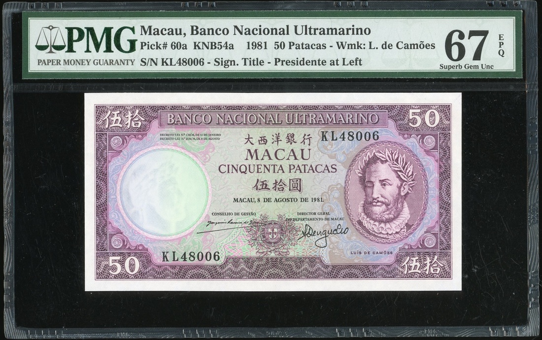 Macau: Banco Nacional Ultramarino, 50 patacas, 1981, serial number KL48006, (Pick 60a), PMG 67EPQ.