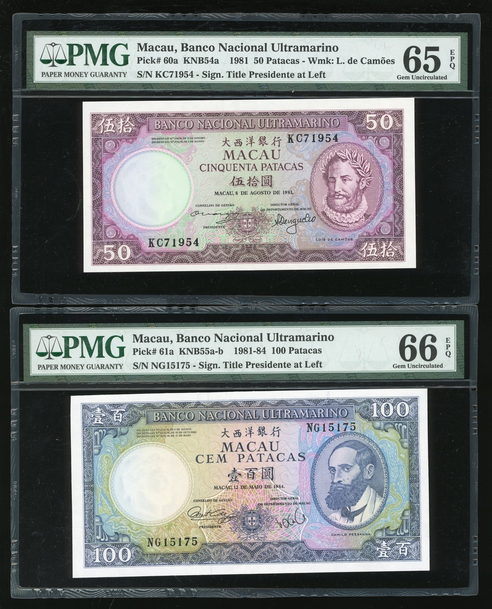 Macau: Banco Nacional Ultramarino, a pair of 50 and 100 Patacas, 8.8.1981 and 12.5.1984, serial numbers KC71954 and NG15175, both with signature title 'Presidente' at left,