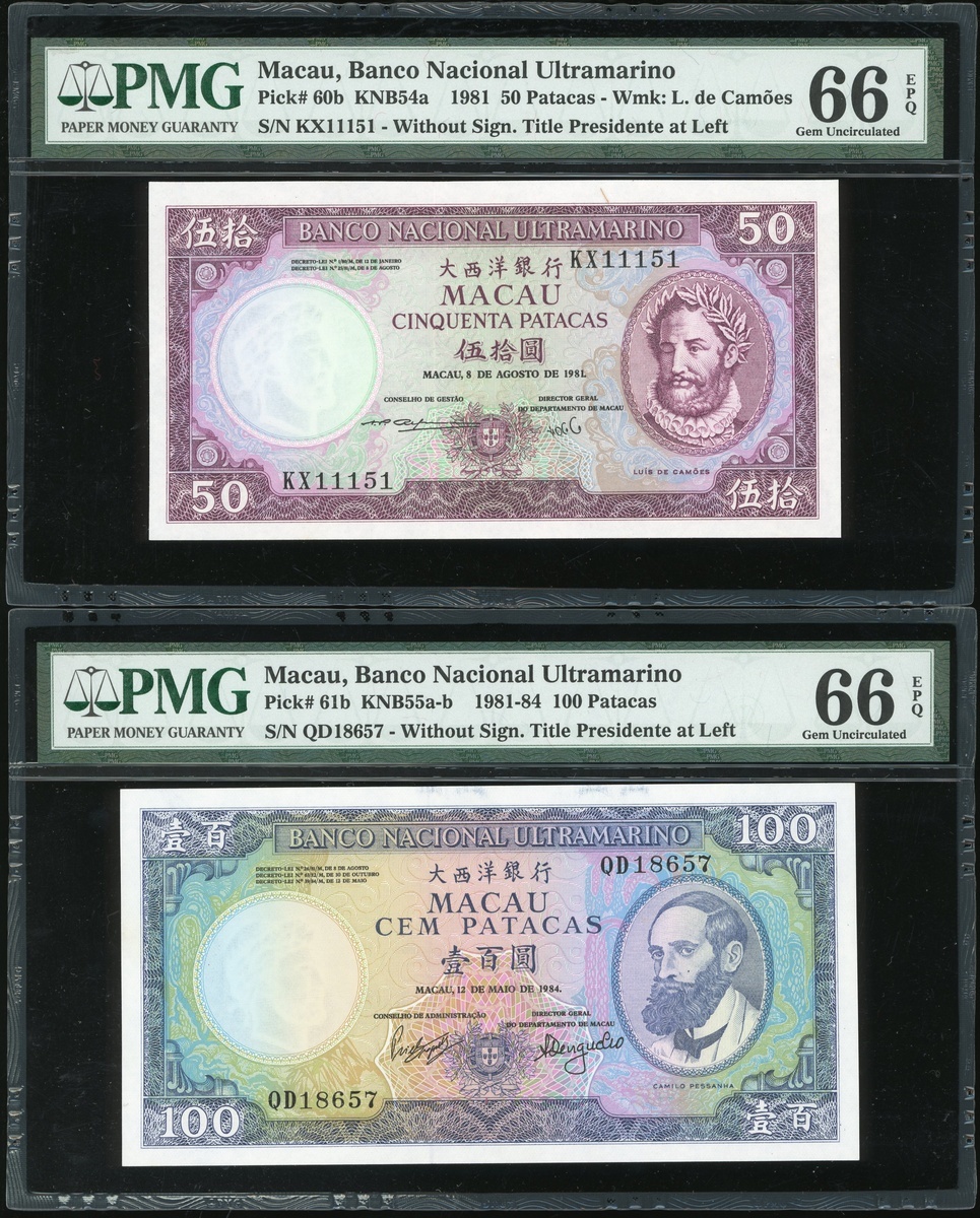 Macau: Banco Nacional Ultramarino, a pair of 50 and 100 Patacas, 8.8.1981 and 12.5.1984, serial numbers KC11151 and QD18657, both without signature title,