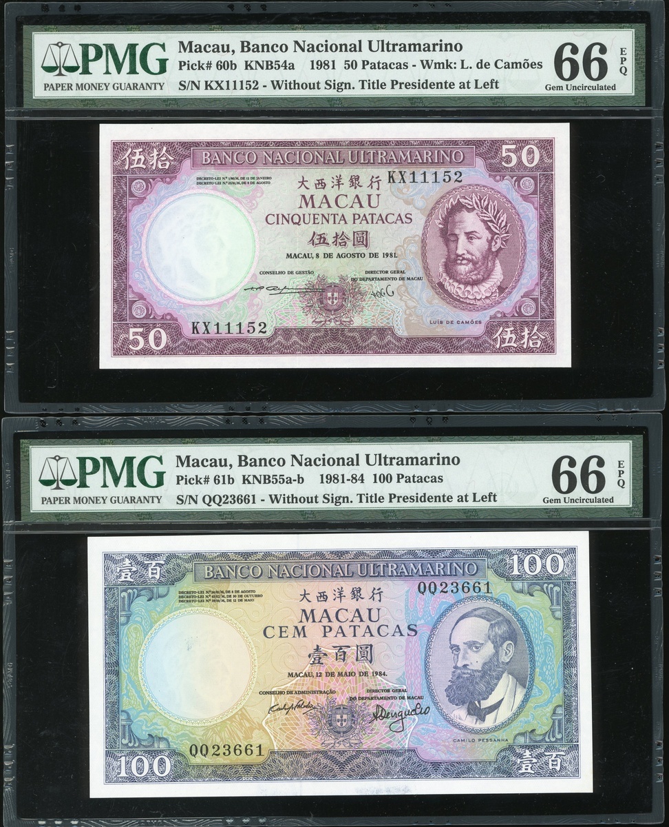 Macau: Banco Nacional Ultramarino, a pair of 50 and 100 Patacas, 8.8.1981 and 8.5.1984, serial numbers KX11152 and QQ23661, both without signature title,