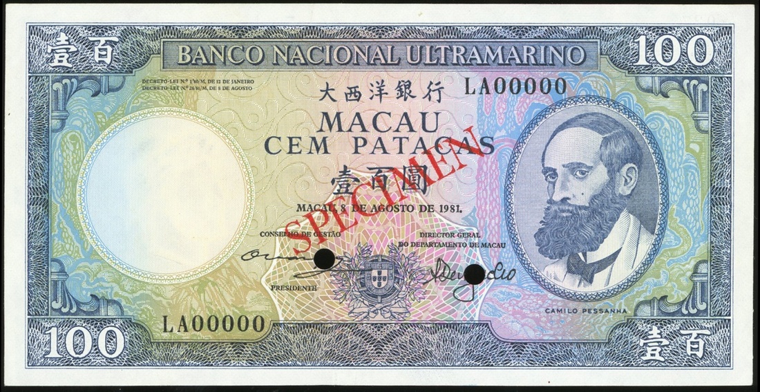 Macau: Banco Nacional Ultramarino, 100 patacas, 1981, specimen, black serial number LA00000, control number 027, (Pick 61s1), uncirculated.