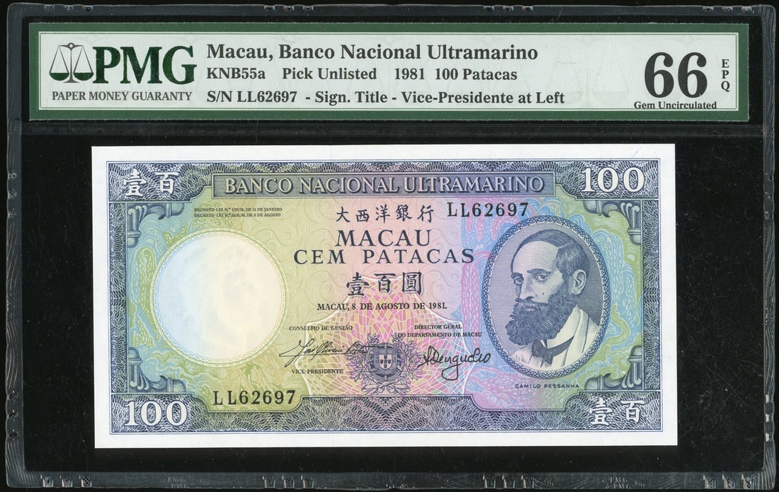 Macau: Banco Nacional Ultramarino, 100 patacas, 1981, serial number LL62697, (Pick unlisted), PMG 66EPQ.