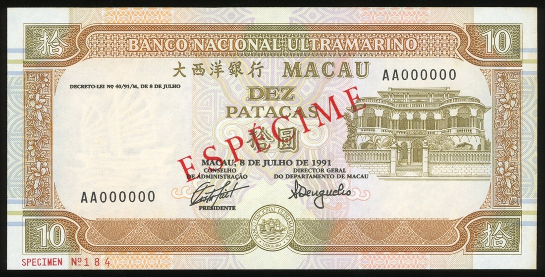 Macau: Banco Nacional Ultramarino, 10 patacas, 1991, specimen, black serial number AA000000, control number 184, (Pick 65s), uncirculated.