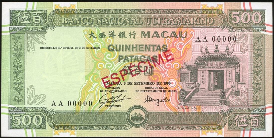 Macau: Banco Nacional Ultramarino, 500 patacas, 1990, specimen, black serial number AA00000, (Pick 69s1), uncirculated.