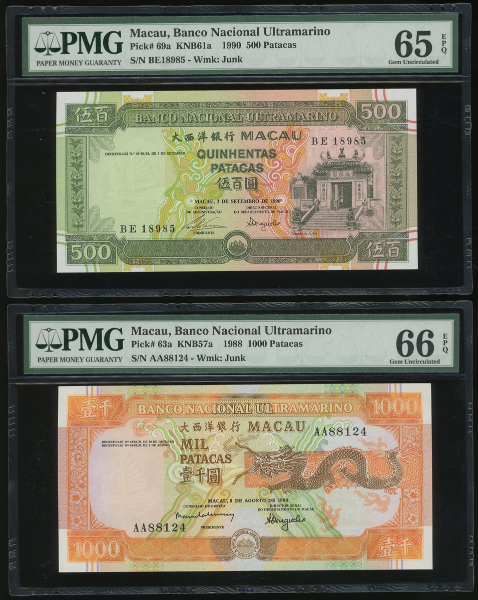 Macau: Banco Nacional Ultramarino, a pair of 500 and 1000 Patacas, 3.9.1990 and 8.8.1988, serial numbers BE 18985 and AA 88124, (Pick 69a, 63a), graded PMG 65EPQ and 66EPQ respectively (2)