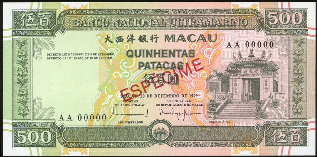 Macau: Banco Nacional Ultramarino, 500 patacas, 1999, specimen, black serial number AA00000, (Pick 74s), uncirculated.