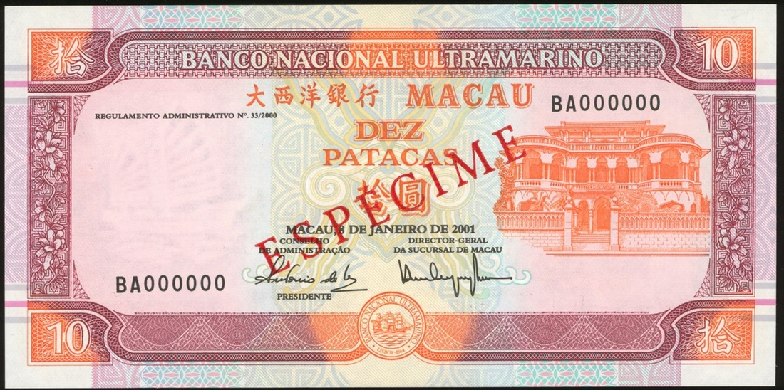 Macau: Banco Nacional Ultramarino, 10 patacas, 2001, specimen, black serial number BA000000, (Pick 76s), uncirculated.