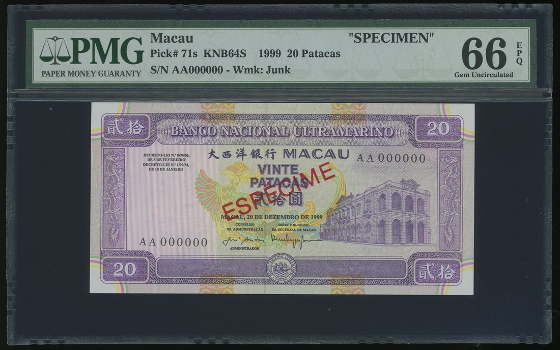 Macau: Banco Nacional Ultramarino, 20 Patacas specimen, 20.12.1999, serial number AA 000000, (Pick 71s), PMG 66EPQ Gem Uncirculated
