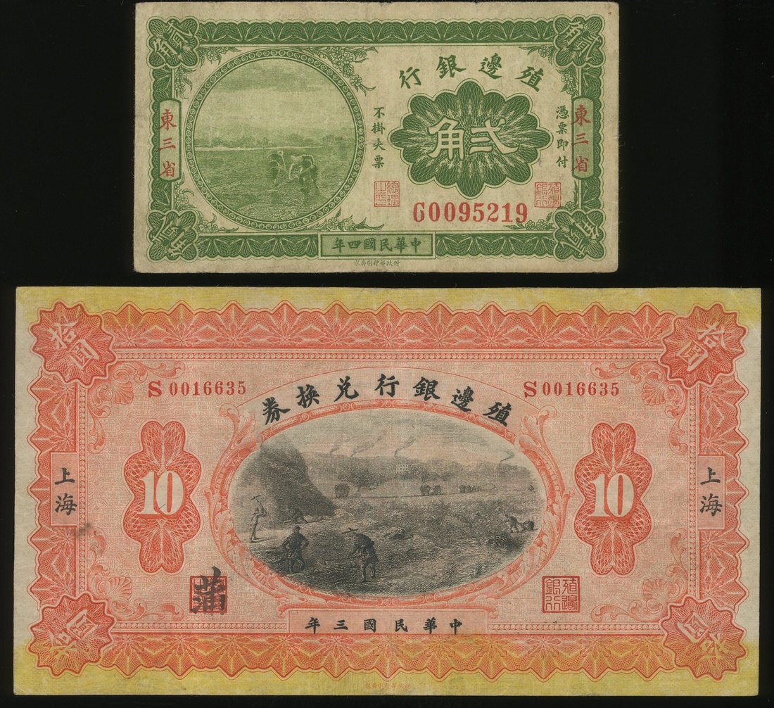 The Bank of Territorial Development, 20 cents, Manchuria, 1915, serial number G0095219 and 10 Yuan, Shanghai, 1914, serial number S0016635, (Pick 571, 586h), very fine (2)