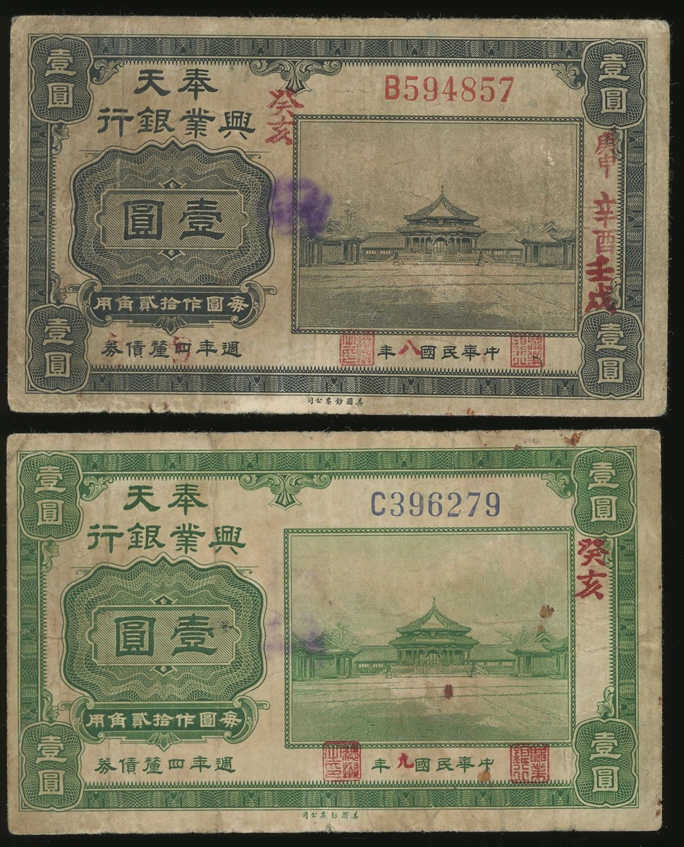Mukden Bank of Industrial Development, a pair of 1 Yuan, 1919 and 1920, serial numbers B594857 and C396279, black and black respectively,