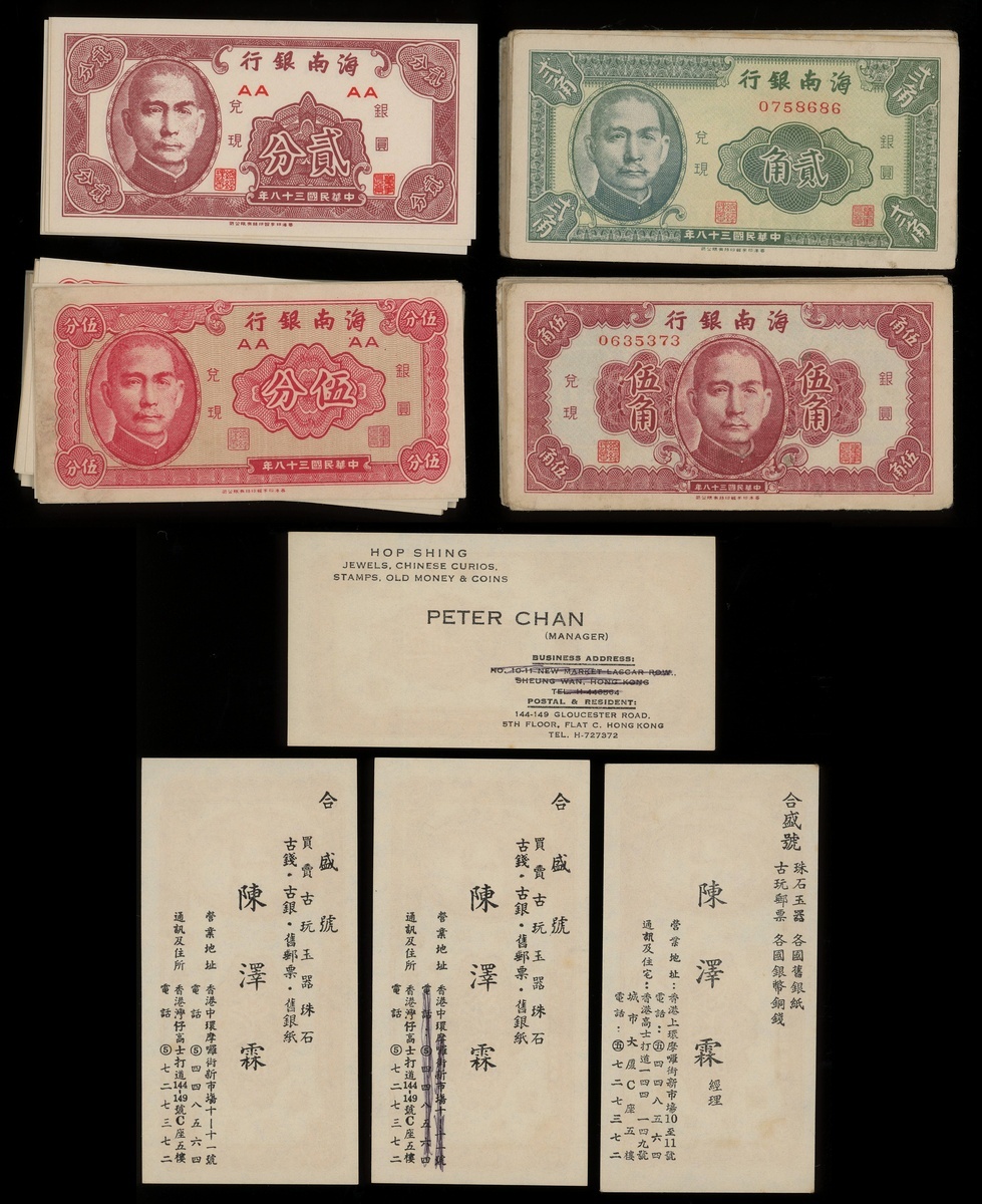 Hainan Bank, a group of 5x 2 cents, 49x 5 cents, 34x 20 cents and 15x 50 cents, 1949, the 2 and 5 cents uniface obverse, with block number AA, four of 5 cents with black English or Chinese text printed as name card, the 20 and 50 cents with different serial numbers,