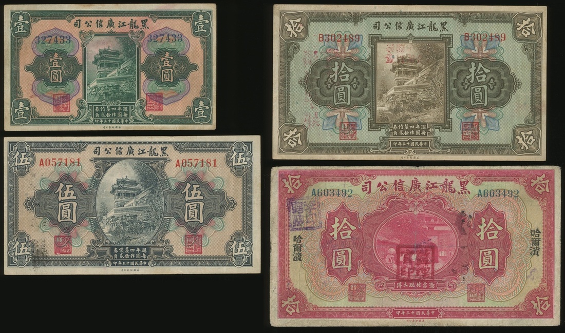Kuang Hsin Syndicate of Heilungkiang, group of 4 notes, 1, 5 and 10 Yuan, 1924, serial numbers 327433, A057181 and B302489, complete type set of the 'dollar bond' issue, also 10 Yuan, Harbin, 1924, serial number A603492,