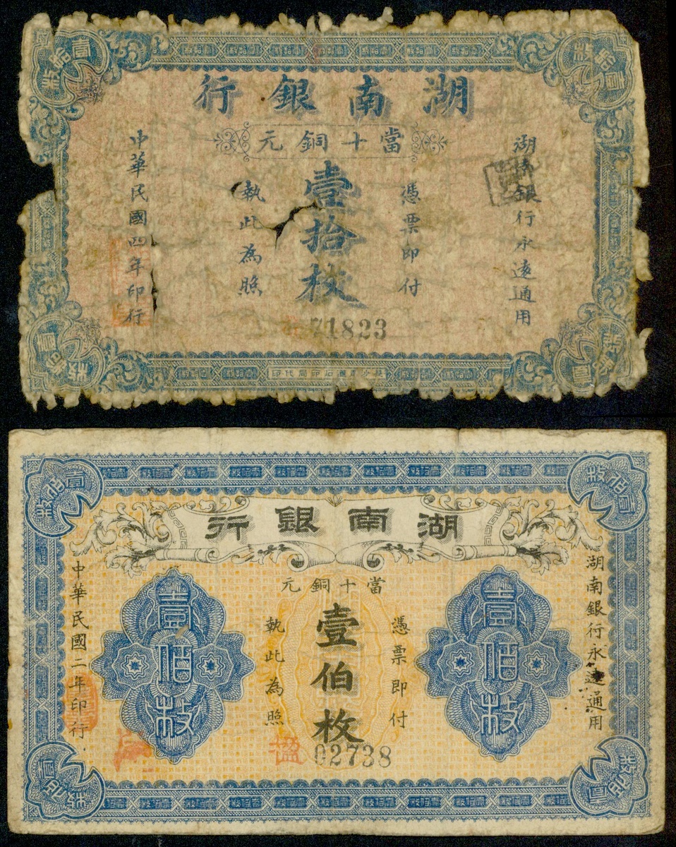 Hunan Bank, lot of 2 notes, 100 coppers, 1913 and 10 coppers, 1915, blue on orange, black Chinese text,