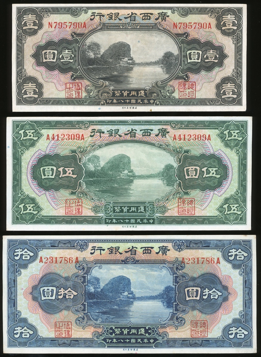 The Provincial Bank of Kwangsi, lot of 1, 5 and 10 Yuan, without place of issue, 1929, serial numbers N795790A, A412309A and A231786A, (Pick S2239-S2241), average extremely fine (3)