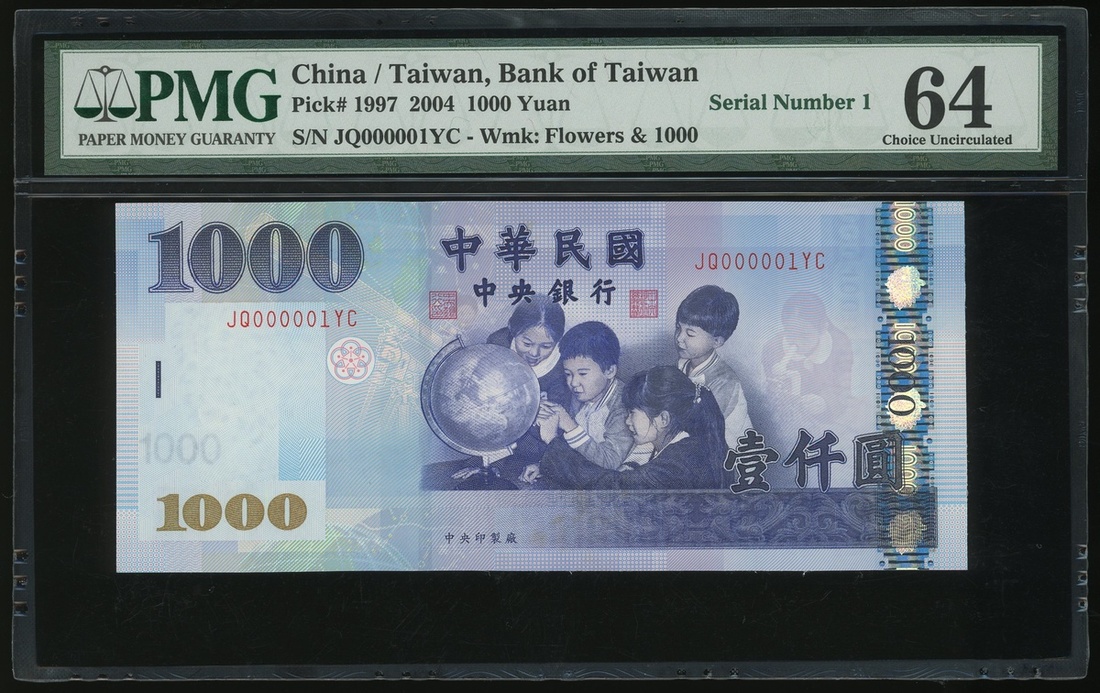 Bank of Taiwan, 1000 Yuan, 2004, low serial JQ0000001YC, (Pick 1997), PMG 64 Choice Uncirculated