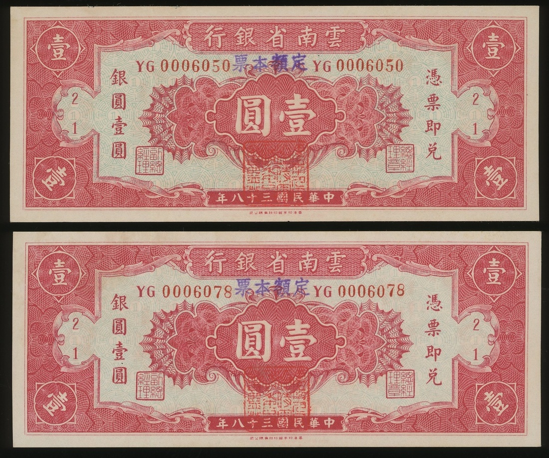 The Yunnan Provincial Bank, a pair of 1 yuan, 1949, serial number YG0006050, 0006078, blue Chinese characters stamped at top centre,