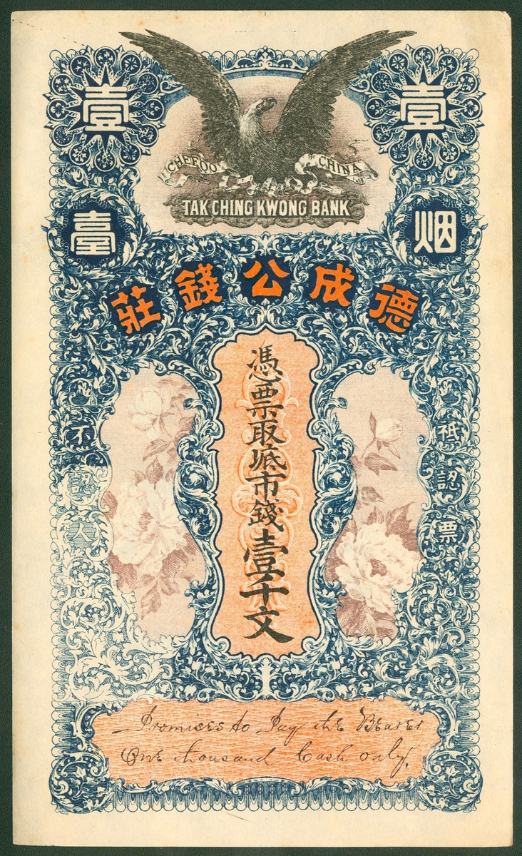 Tak Ching Kwong Bank, Chefoo, 1000 cash, remainder, ND, red, blue and black, vertical format, floral ornate border,