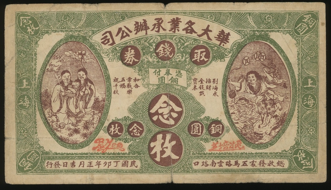 Hwa Dai Trust Co. 20 coppers, coupon, 1927, green and purple-brown, Chinese folktale scenes at left and right, reverse blue, Chinese and English text,