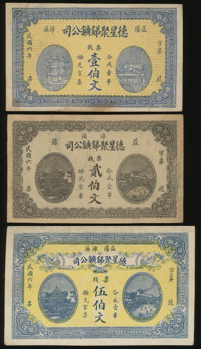 Republican Era, Private Issue, De Xing Ju Tin Mining Company, 100, 200 and 500 cash, 1917, looks to be nearly extremely fine to almost uncirculated but with edge repairs. Viewing recommended, no returns (3)