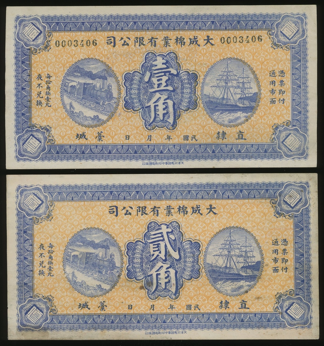 Republican Era, Private Issue, Da Cheng Cotton Comapny Limited, a pair of 10 and 20 cents remainder notes, Chihli, no date, the first note with serial number 0003406, about extremely fine (2)