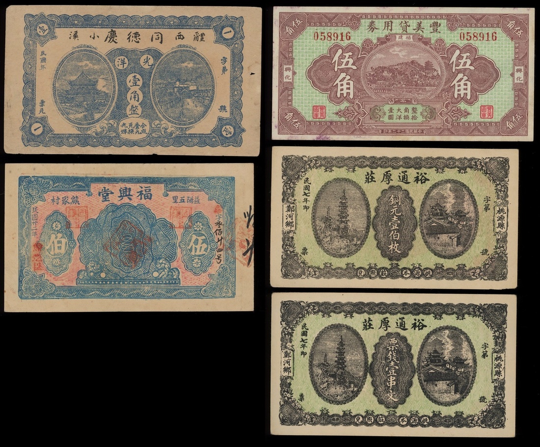 Republican Era, Private Issue, group of 5, consisting of: Tong De Qing, 1 chiao remainder; Fu Xing Tang, 500 coppers, 1933; Feng Mei Local Currency, 5 chiao, 1933; also Yu Tong Hou Zhuang, a pair of 100 coppers and 1 chuan, 1918, no serial remainder,