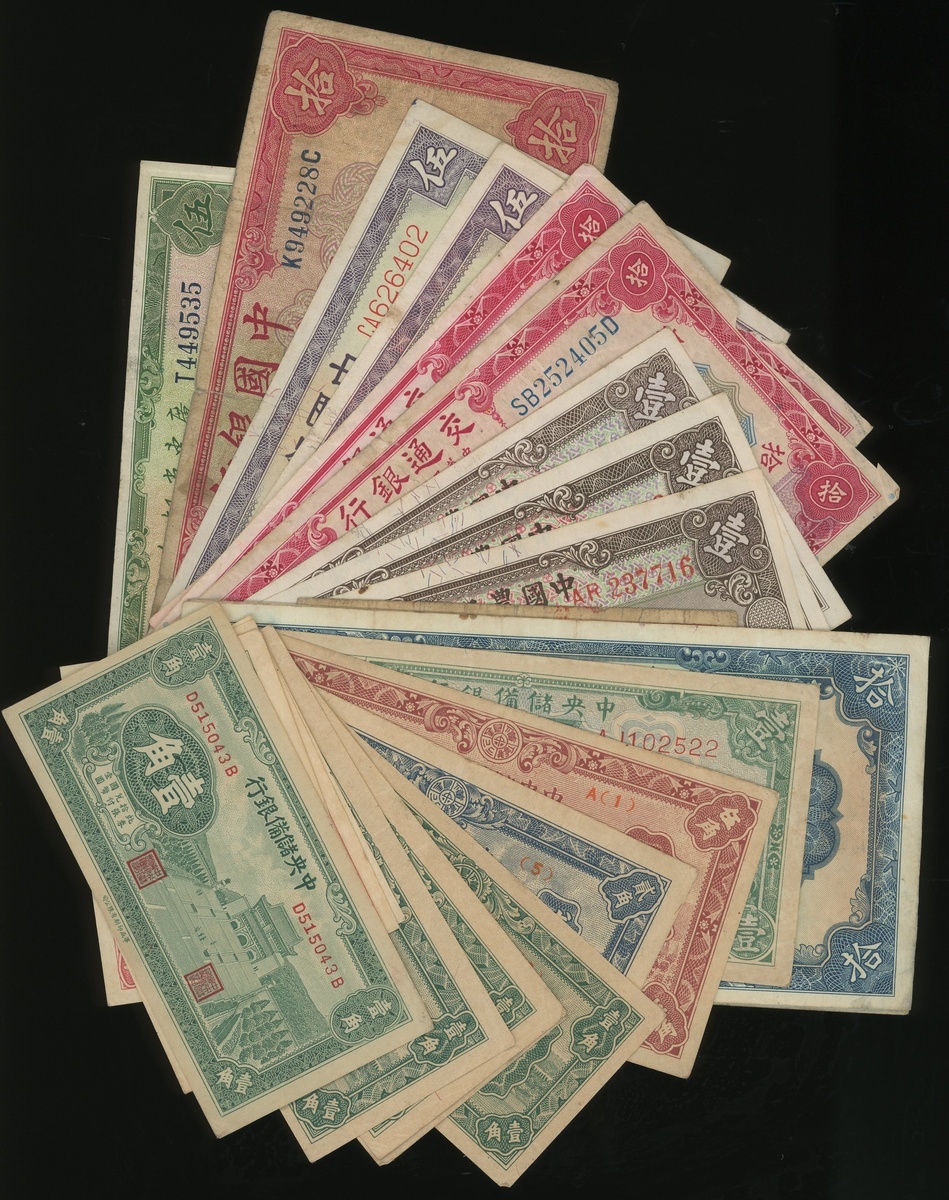 Mixed Lot, a group of 31x Chinese banknotes, Republican era, consisting of Central Reserve Bank of China, 5x 1fen, 3x 5 fen, 10 cents, all 1940, 4x 10 cents, 20 and 50 cents, 1 yuan, 1943, 2x 10 yuan, 1940, Amoy Industrial Bank, 10 cents, Farmers Bank of China, 1 yuan, 1940, 3x 1 yuan, 1941, Bank of Communications, a pair of 10 yuan, 1914, Bank of China, 10 and 20 cents, a pair of 5 yuan, 1937, 10 yuan, 1940, Kwangtung Provincial Bank, $5, 1931,