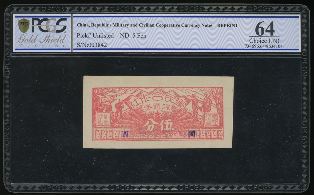 Military and Civilian Cooperative Currency Notes, uniface 5 fen, ND, serial number 003842, reprint,
