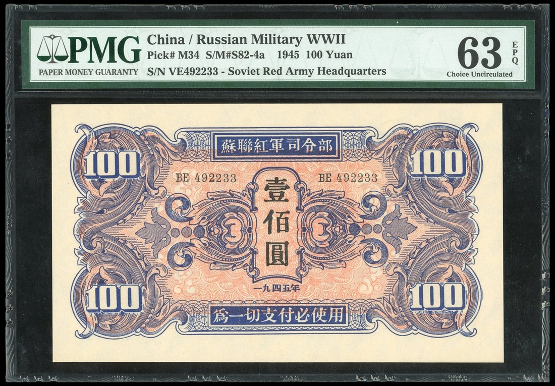 Soviet Red Army Headquarters, 100 Yuan, 1945, serial number BE 492233, (Pick M34), PMG 63EPQ Choice Uncirculated