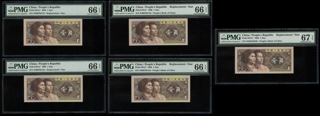 People's Bank of China, 4th series renminbi, 1980, 5x 1 Jiao, consecutive replacement serials JO00705121-124 and JO05248432,