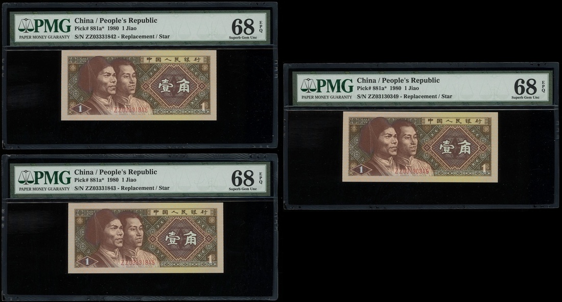 People's Bank of China, 4th series renminbi, 1980, 3x 1 Jiao, replacement serials ZZ03130349, ZZ03331842-843,