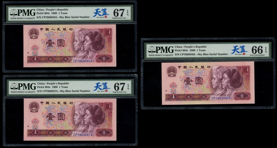 People's Bank of China, 4th series renminbi, 1980, group of 3x 1 Yuan, sky blue serial numbers CP78630424, 474 and 485,