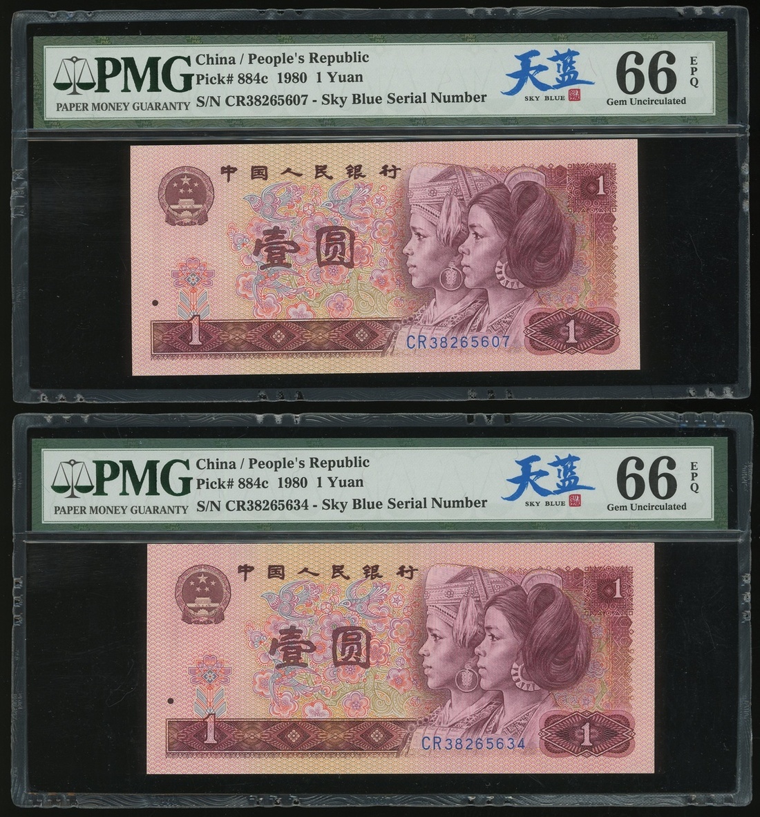 People's Bank of China, 4th series renminbi, 1980, pair of 1 Yuan, sky blue serial numbers CR38265607 and CR38265634,