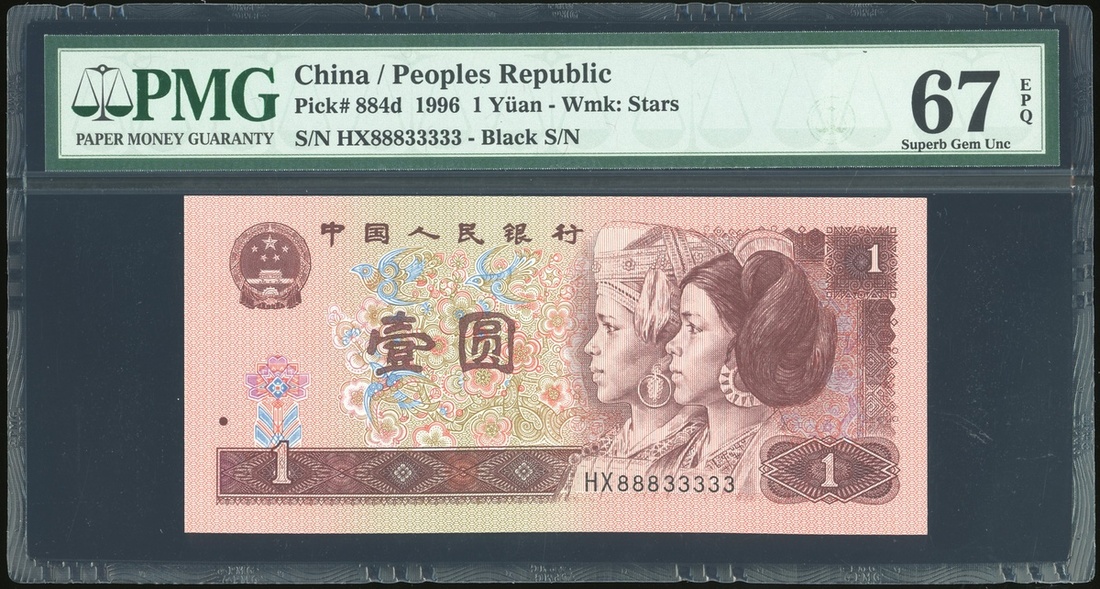 People's Bank of China, 1 yuan, 1996, serial number HX88833333, (Pick 884d), PMG 67EPQ, superb gem uncirculated.