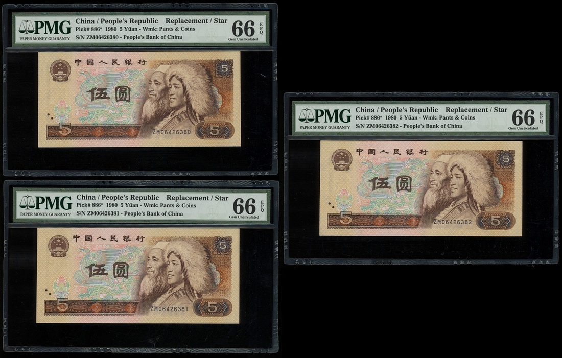 People's Bank of China, 4th series renminbi, 1980, a consecutive group of 3x 5 Yuan, replacement serials ZM06426380-382,